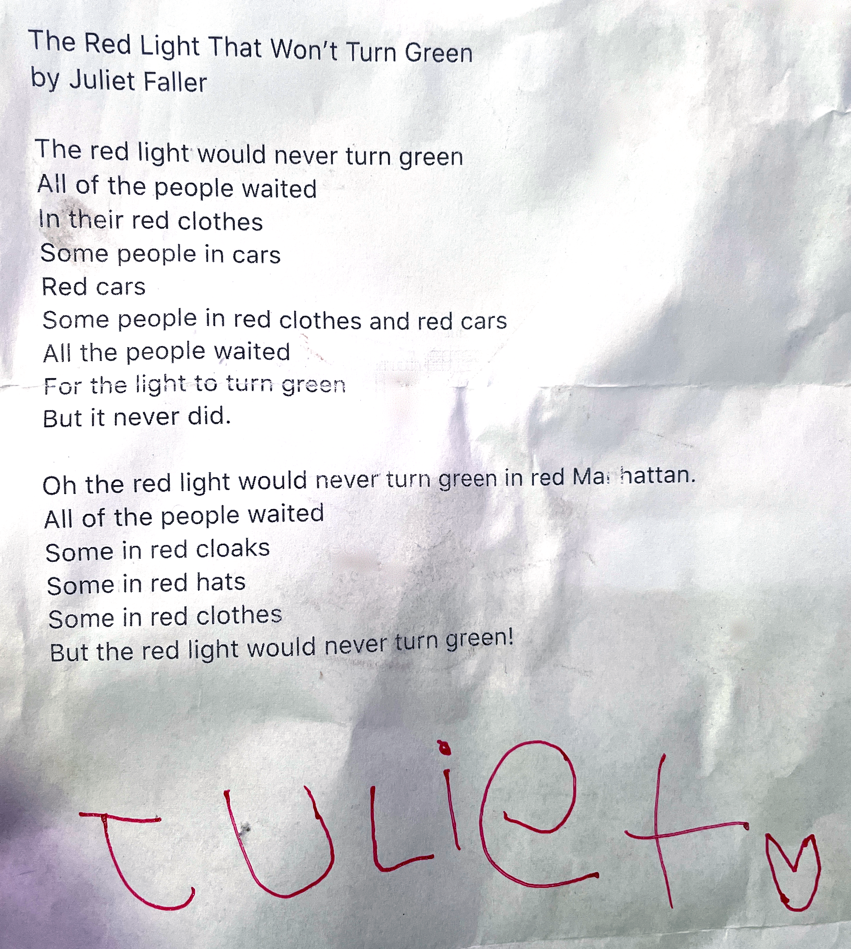 A couple of years ago, my friend Jeremy, loving father of 2 improbably adorable girls, dropped into a pandemic-era chat room where I hang out, and shared with us a poem that his then 5-year-old daughter had written. When I heard it, I was thunderstruck, and I asked for a copy of it. She obliged. I’m told that it was her first printout.